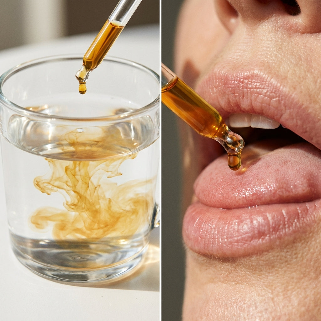 2. Diluer 1 à 2ml (l'équivalent d'une cuillère à café) dans un verre d'eau ou prenez directement sous la langue pour une absorption rapide.